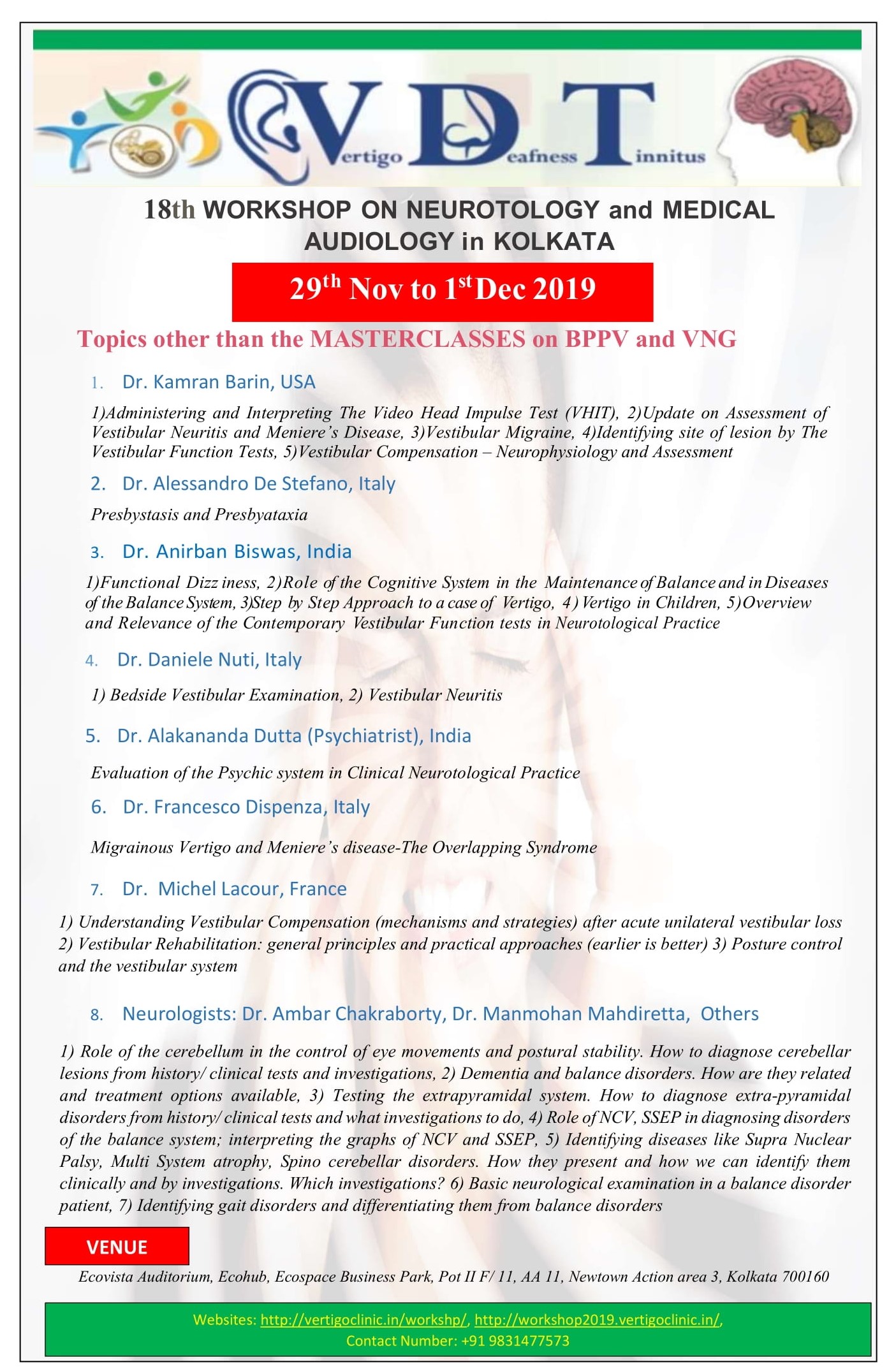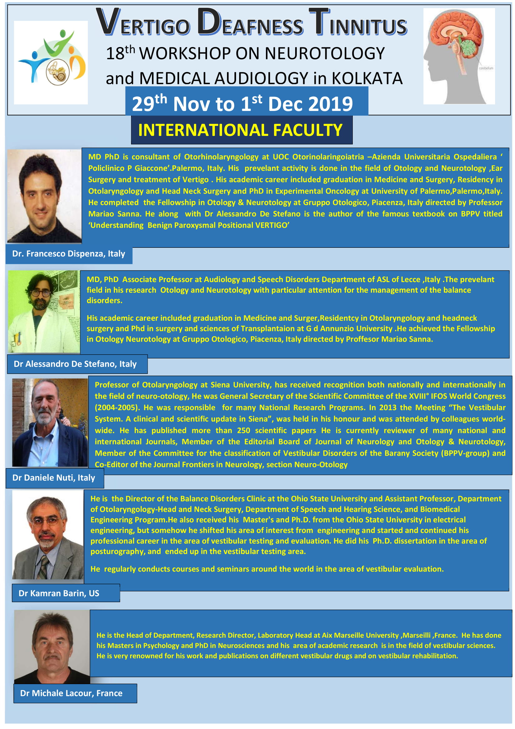 Below are the slides of the presentations of the different speakers who were the faculty of the 18th workshop except for that of Prof Michel Lacour as the official permision from him is yet to come. As these are PDFs of the slides, the animations and videos cannot be shown here. The videos of some of the lectures will be subsequently uploaded after necessary formalities. Looking forward to the active participation of doctors interested in the diagnosis and ethical management of vertigo for our next (19th) workshop the dates of which will be announced here in the near future.